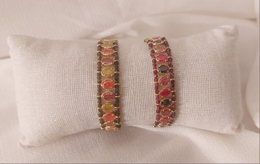 Magnifique bracelet composé de perles brunes facettées et de pierres ovales aux reflets dorés, orangés, ambrés, serties dorées.