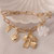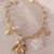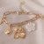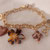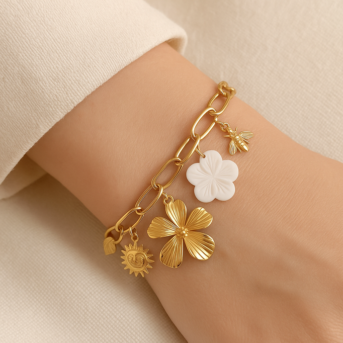 Chaîne à grands maillons ornée de breloques raffinées : une fleur blanche, un soleil, une abeille et une fleur dorée