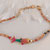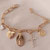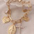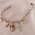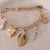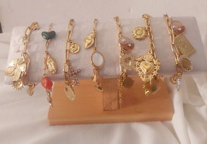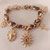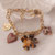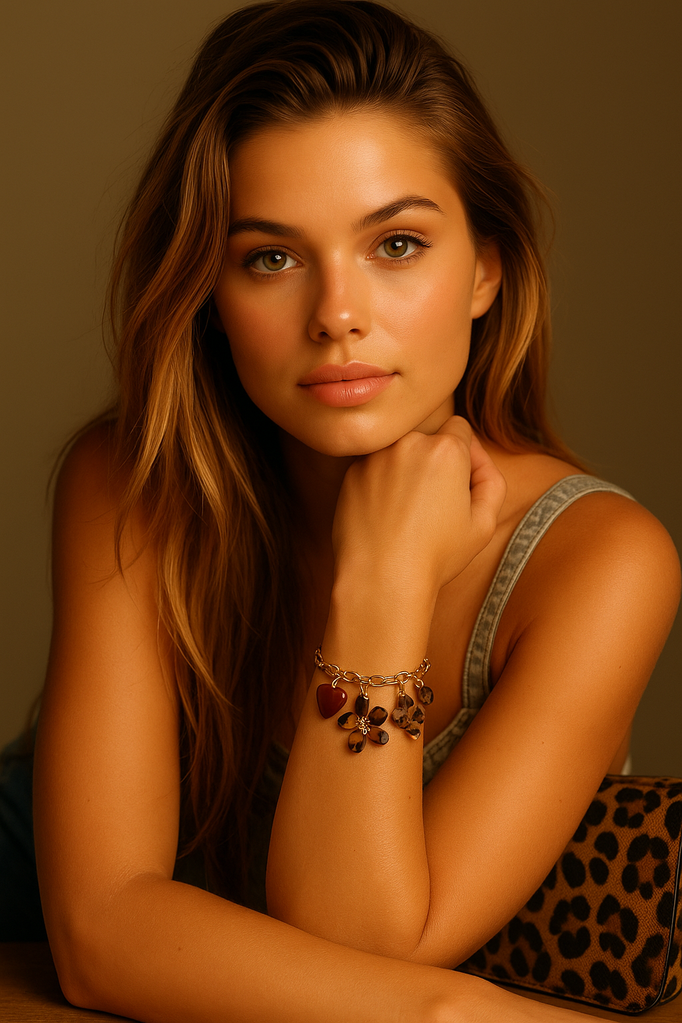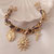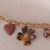 Chaîne maillons épais et larges agrémentée de charmes bruns et léopard : un coeur, une fleur écaille, un trèfle, un noeud, un soleil