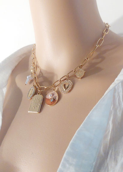 Collier en acier inoxydable doré. Chaîne à mailles larges fines ornée de breloques.